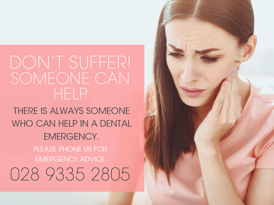 To ease the pain of a toothache while you are waiting to see your dentist speak to a pharmacist and they will advise you on the best over-the-counter painkiller to help with the discomfort. You should also floss around the area to dislodge any food that might be causing the pain. If you have facial swelling, apply a cold compress to the outside of your mouth/cheek. Contact Ballyclare Dental for an emergency appointment as soon as possible.